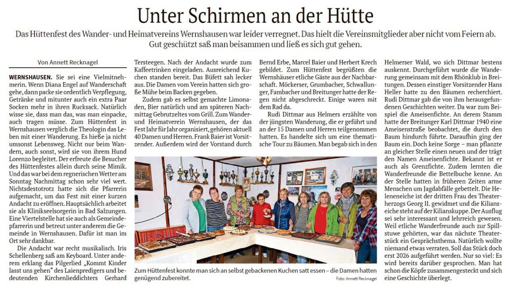 Am 20. Juli 2025 war es wieder soweit. Unsere jährliche Roßbachwanderung stand auf dem Plan. Froh gelaunt, ging es dieses mal, eine neue Strecke. Vom Gemeindeamt Wernshausen ging es nach Niederschmalkalden, anschließend Richtung Ehrental, über Mittelschmalkalden, Richtung Hundehütte und von da, ins Roßbach. Hier wurden wir, wie jedes Jahr, von der Höhgemeinde exzellent bewirtet. Vielen Dank an Uwe, Sabine, Hartmut und Ingrid!